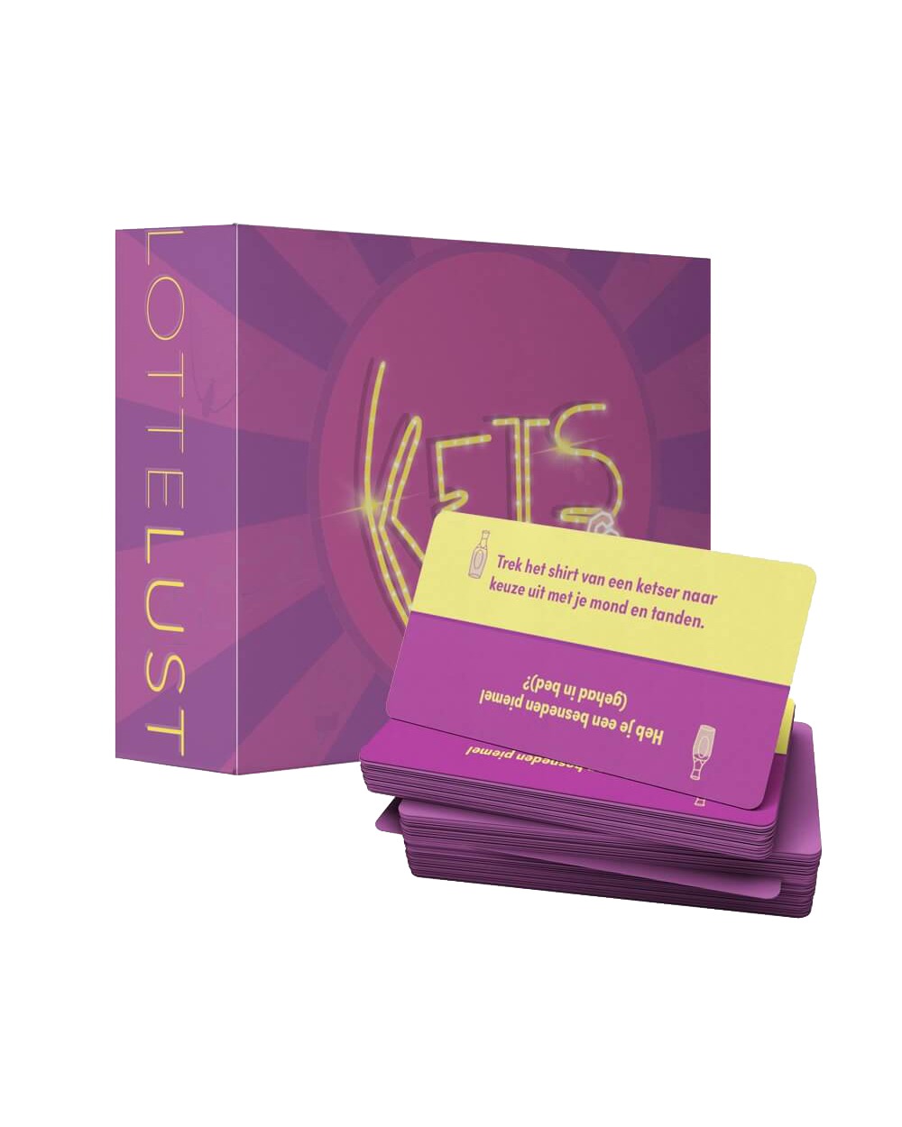 Als je van een feestje houdt, is De Ketsdoos het perfecte spel voor jou en je vriendengroep! Speel je wel eens Truth or Dare, maar heb je zelf niet altijd inspiratie voor leuke opdrachten en vragen, dan zou ik zeker overwegen om De Ketsdoos aan te schaffen. Op elk kaartje staat aan de gele kant een opdracht, en aan de paarse kant een vraag. Voordat je ziet wat erop staat, kies je of je voor paars of geel gaat. Wil je een vraag niet beantwoorden of een opdracht niet uitvoeren? Op het kaartje staat een symbool van een shotglas, wijnglas, fles of longdrink glas. De plaatjes geven aan wat jouw ‘straf’ is. Krijg jij bijvoorbeeld de vraag: ‘Heb je weleens seks gehad waar anderen bij waren?’ en wil je die niet beantwoorden. Dan moet je een shot nemen, gezien er een shotglaasje op de kaart staat.