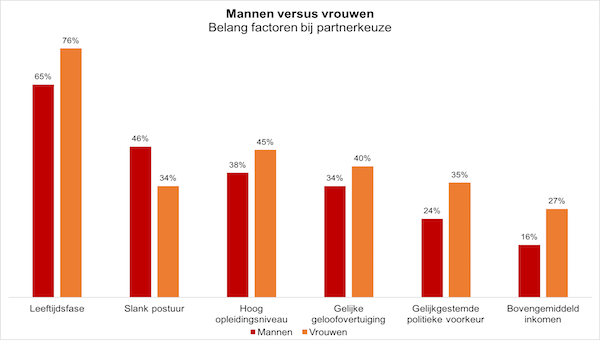 Het is waarschijnlijk geen verrassing, maar mannen en vrouwen verschillen van mening over wat zij eisen bij hun partnerkeuze. Zo vinden vrouwen het belangrijker dan mannen dat hun partner een bovengemiddeld inkomen heeft en is ook de leeftijdsfase van een potentiële lover relevanter voor vrouwen dan mannen.