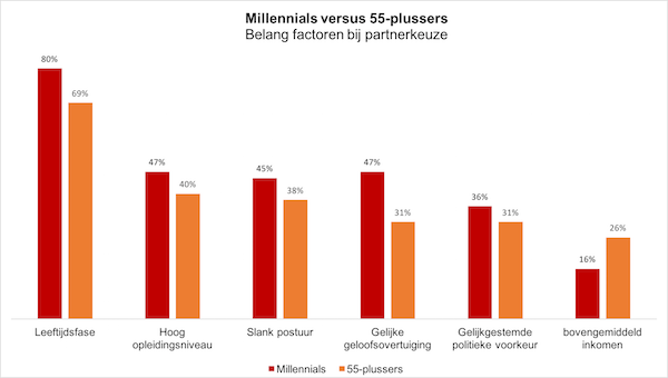 Zo bleken millennials kritischer te zijn dan 55-plussers, op bijna alle fronten. Ten eerste vinden millennials het belangrijker dan ouderen dat hun partner in dezelfde leeftijdsfase zit, dezelfde geloofsovertuiging en politieke voorkeur heeft, een hoge opleiding heeft genoten en als kers op de taart dat hij/zij een strak lichaam heeft. Alleen qua inkomen stellen de 55-plussers hogere eisen dan jongere ondervraagden.