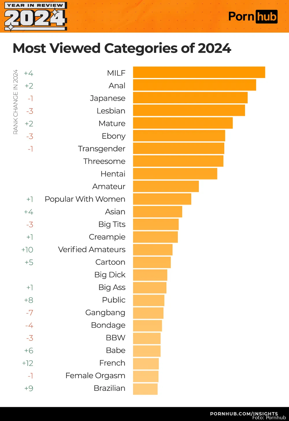 We hoeven jullie vast niet uit te leggen wat het verschil is tussen categorieën en zoektermen. Kort gezegd: categorieën worden samengesteld door Pornhub zelf, terwijl zoektermen rechtstreeks uit de zoekbalk van gebruikers komen. Toch lopen ze vaak hand in hand. Dit jaar steeg de categorie MILF maar liefst vier plekken, wat het direct tot de meest bezochte categorie in Nederland maakt. In Amerika daarentegen staat Ebony bovenaan – hoewel die categorie opvallend genoeg niet in de wereldwijde top 3 voorkomt. Hier voeren Anal (plek 2) en Japanese (plek 3) de lijst aan. Lesbian, vorig jaar nog een vaste kracht in de top 3, is gezakt naar een vierde plek.