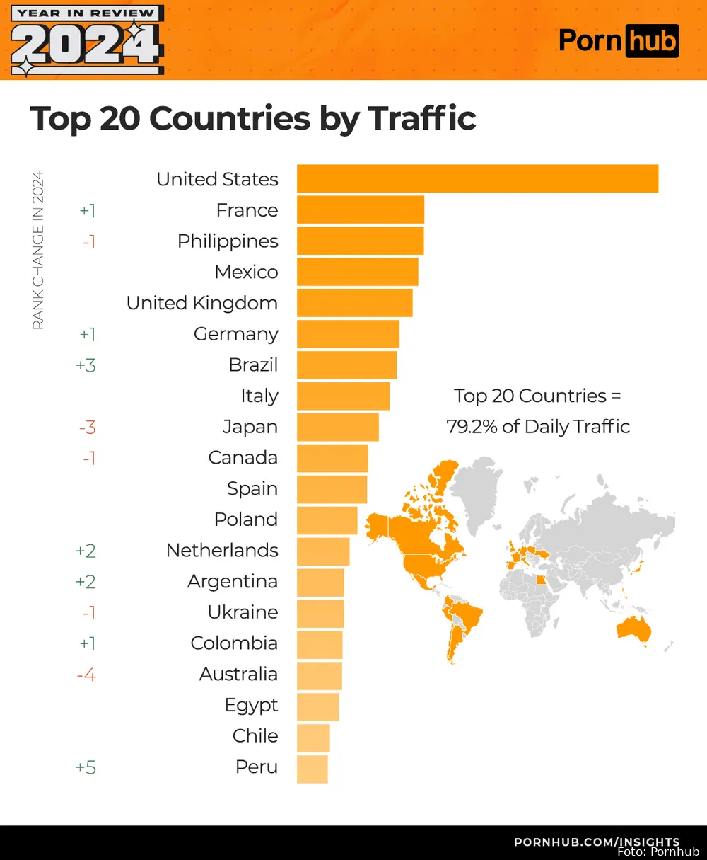Het zal je niet verbazen, maar ook dit jaar kroont de USA zich als het absolute walhalla van online porno. Geen land kijkt méér dan de Amerikanen! Op nummer twee vinden we Frankrijk, het land van de liefde. Maar het lijkt erop dat het daar niet alleen om romantiek draait, want de Fransen hebben hun plek van vorig jaar goed verdedigd. Dit zou natuurlijk ook te maken kunnen hebben met de Olympische Spelen van afgelopen zomer. Zoektermen zoals ‘sex olympics’ en ‘gymnastics’ (+79%) waren populairder dan ooit. Zelfs Paris stond hoog in de zoekresultaten, hoewel we vermoeden dat dat niet alleen vanwege de stad van de liefde was. Frankrijk heeft zelfs een wissel gemaakt met de Filipijnen, die nu op de derde plaats staan. En hoe zit het met ons eigen kikkerlandje? Nederland heeft zich met een sprong van twee plekken omhoog stevig genesteld op nummer 13. Niet slecht voor zo’n klein landje, toch?