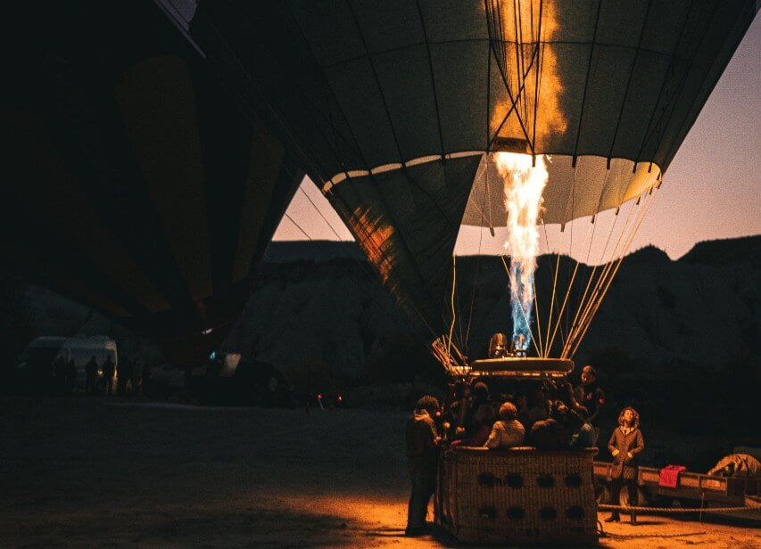 Elsje en ik kijken elkaar nog eens aan. Ik twijfel, kunnen we dat wel maken, ons plannetje met deze gast aan boord. Elsje pakt door en geeft een knipoog, we gaan ervoor. Na wat instructie stappen we met ons allen aan boord in de mand. Dan worden de lijnen gelost en onze jonge ballonpiloot geeft een oorverdovende dot gas. Grote vlammen schieten de onderkant van de ballon in die zich opnieuw met hete lucht vult. De ballon komt los en we drijven langzaam weg, de hoogte in.