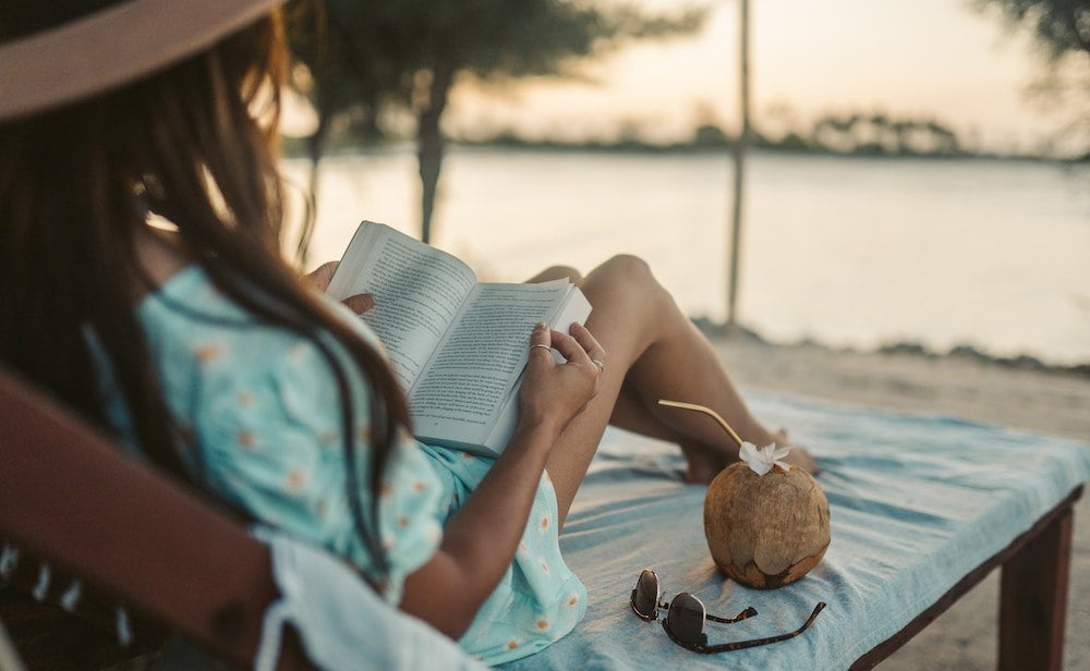 Na twee hoofdstukken te hebben gelezen merk ik ineens hoe warm ik het heb gekregen. De schaduw is inmiddels langzaam verschoven en de ene helft van mijn lijf ligt vol in de zon. Pas nu merk ik de zweetdruppels op mijn bovenlip. Ik kijk naast me en zie dat Nick is weg gesukkeld. Zijn telefoon is naast zijn lijf gevallen en in zijn glas dobberen de laatste restjes van de grote ijsklontjes.